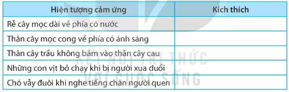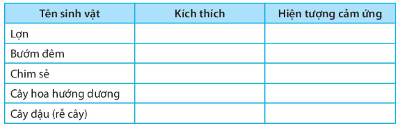 Bài 33.4 trang 76 SBT Khoa học tự nhiên 7: Quan sát các hiện tượng cảm ứng của một số sinh vật thường gặp trong thực tiễn và hoàn thành các thông tin vào bảng theo mẫu sau: