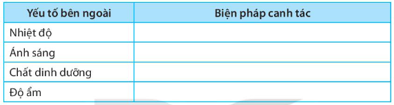 Bài 37.5 trang 83 SBT Khoa học tự nhiên 7: Vận dụng kiến thức về ảnh hưởng của các yếu tố bên ngoài tác động đến quá trình sinh trưởng và phát triển của thực vật, hãy đề xuất các biện pháp canh tác giúp cây trồng sinh trưởng tốt, cho năng suất cao theo mẫu sau: