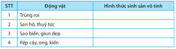 Bài 39.4 trang 86 SBT Khoa học tự nhiên 7: Các loài động vật trong bảng sau sinh sản vô tính bằng hình thức nào?