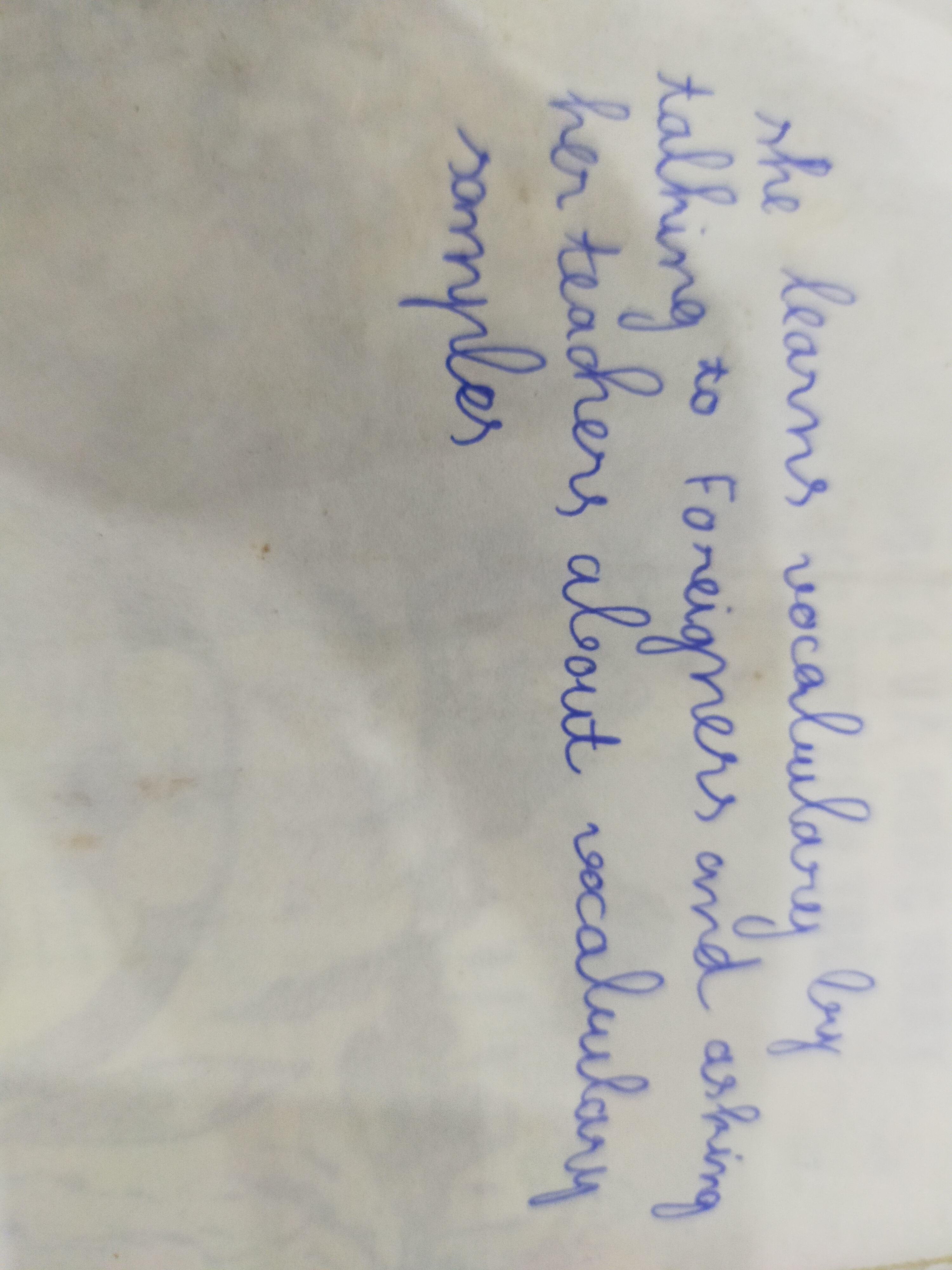 She learns vocabulary by talking to foreigners and asking her teacher