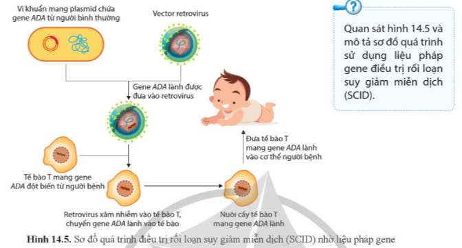 Câu hỏi trang 85 Sinh 12: Quan sát hình 14.5 và mô tả sơ đồ quá trình sử dụng liệu pháp gene điều trị rối loạn suy giảm miễn dịch (SCID).