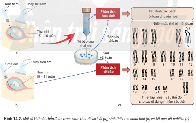 Quan sát Hình 14.2, hãy cho biết tại sao sử dụng kĩ thuật chẩn đoán trước sinh có thể giúp xác định được những bệnh, tật di truyền ở người.