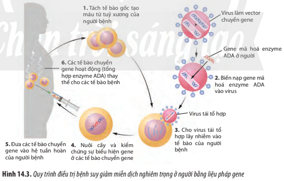 Quan sát Hình 14.3, hãy cho biết dựa trên cơ sở nào mà liệu pháp gene có thể được sử dụng để điều trị các bệnh, tật di truyền ở người. Cho ví dụ.