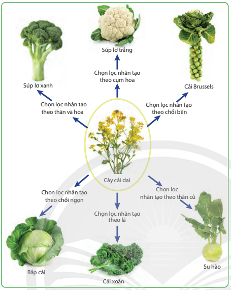 Chọn lọc nhân tạo hình 16.4: Thông qua quá trình chọn lọc, con người đã giữ lại những biến dị di truyền phù hợp với mục tiêu sản xuất để cho nhân giống riêng, đồng thời loại bỏ các biến dị không có lợi cho con người, không phù hợp với mục đích sản xuất. Chỉ qua một số thế hệ, con người có thể tạo nên giống mới.