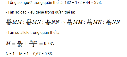 Câu hỏi 3 trang 95 Sinh học 12: Trong một quần thể người, các nhà di truyền đã xác định được có 182 người có nhóm máu MM, 172 người có nhóm máu MN và 44 người có nhóm máu NN. Hãy tính tần số allele M, N và tần số các kiểu gene của quần thể này.