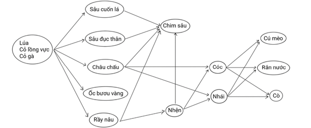 Lúa / cỏ lồng vực / cỏ gà → sâu cuốn lá / sâu đục thân / châu chấu / rầy nâu → chim sâu.