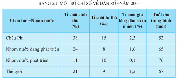 Dựa vào bảng 5.1, so sánh và nhận xét về các chỉ số dân số của châu Phi so với nhóm nước phát triển, nhóm nước đang phát triển và thế giới.