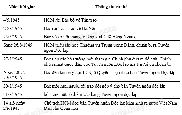 Thông tin được nhắc đến ở phần 3: 14 giờ ngày 2 tháng 9 năm 1945, tại quảng trường Ba Đình, chủ tịch Hồ Chí Minh đọc bản tuyên ngôn độc lập khai sinh ra nước Việt Nam Dân chủ Cộng hòa.