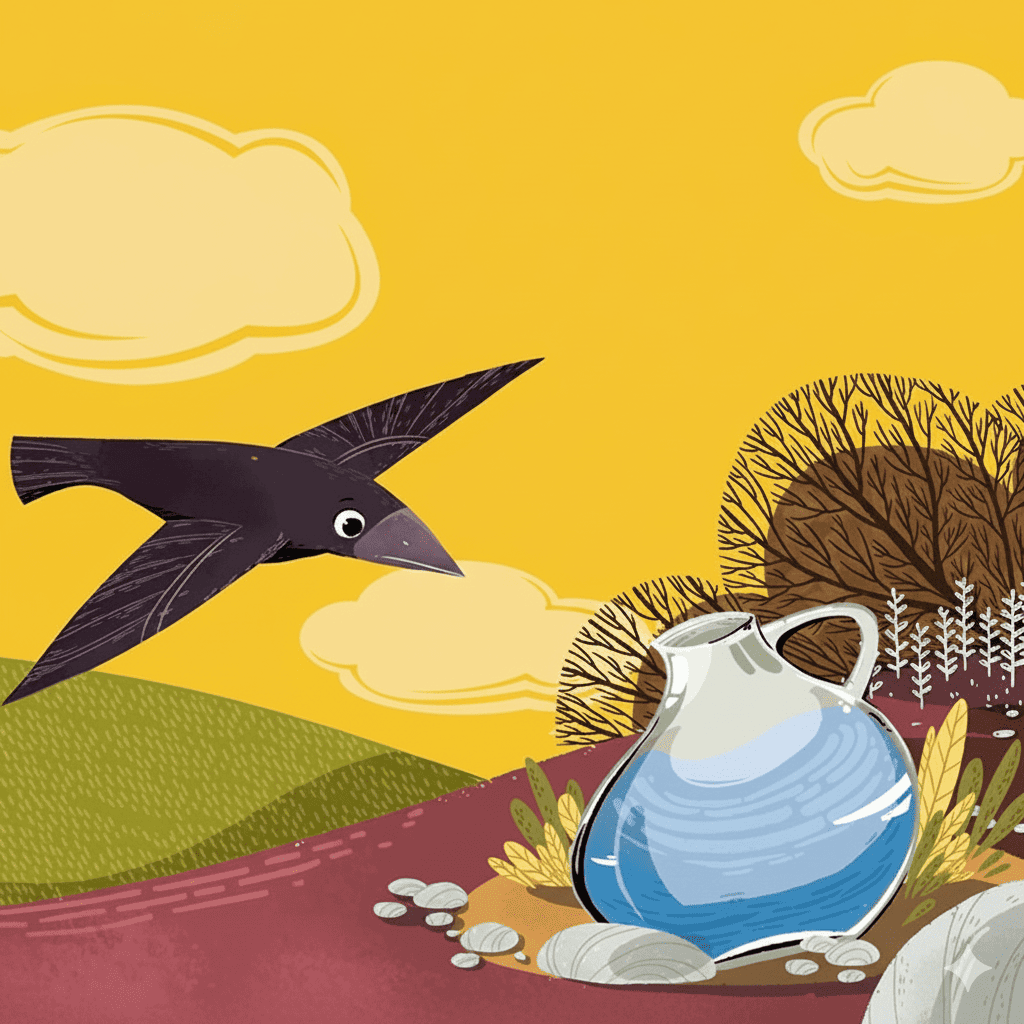 Một con quạ đang khát nước. Nó bay mãi nhưng chẳng kiếm được một giọt nào. Mệt quá, nó đậu xuống một cành cây để nghỉ. Nó nhìn thấy một cái bình ở dưới gốc cây.