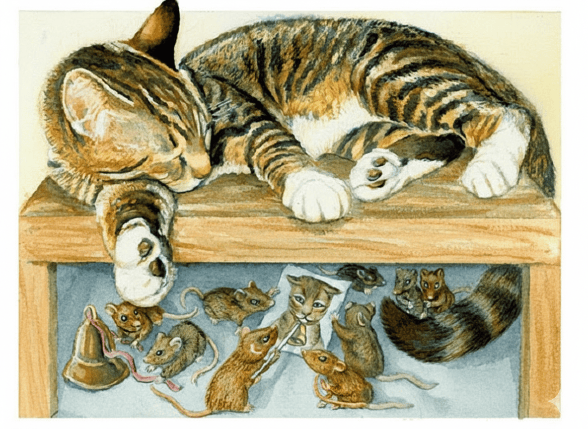 - Cái giống quái kia sở dĩ nó chụp được anh em mình chỉ vì trời phú cho nó cái tài rình mò và khéo bắt lén mà thôi. Bây giờ, bà con ta nên mua một cái nhạc buộc vào cổ nó, để khi nào nó đến, nghe tiếng nhạc, ta biết đường chạy trước, thì nó còn làm gì nổi ta nữa.