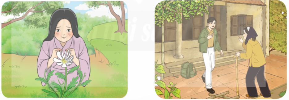 - Bức tranh Sự tích hoa cúc trắng: người con đã vượt núi băng rừng, tìm thấy bông hoa cúc trắng, xé nhỏ từng chiếc cánh hoa thành nhiều sợi nhỏ để mẹ có thể sống khỏe thật lâu cùng với mình