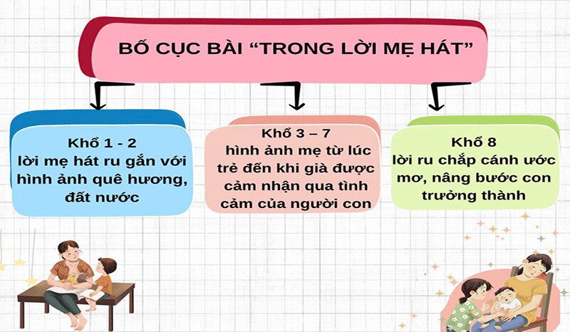 - Khổ 1, 2: lời mẹ hát ru gắn với hình ảnh quê hương, đất nước.
