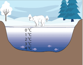- Ở xứ lạnh, về mùa đông, trong các hồ nước, lớp nước 4oC nặng nhất chìm xuống đáy hồ, nhờ vậy cá vẫn có thể sinh sống dưới đáy hồ, mặc dù trên mặt hồ nước đã đóng thành lớp băng dày.