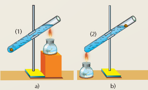 - Đun nóng nước ở gần miệng ống nghiệm (1), quan sát xem miếng sáp có bị nóng chảy hay không (Hình a).