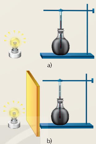 Chuẩn bị: Một bình thuỷ tinh đã phủ đen, bên trong có đặt một nhiệt kế. Đèn điện dây tóc.Tấm gỗ dày. Tiến hành: Bố trí thí nghiệm như hình bên dưới Bật đèn, theo dõi sự thay đổi nhiệt độ của nhiệt kế khi chưa đặt tấm gỗ (Hình a). Đặt tấm gỗ vào giữa đèn và bình thủy tinh (Hình b), theo dõi sự thay đổi nhiệt độ của nhiệt kế. |