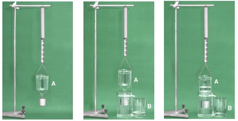 - So sánh số chỉ lực kế khi đổ nước từ cốc B vào cốc A với số chỉ của lực kế khi chưa nhúng khối trong nước.