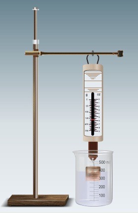 Chuẩn bị: Lực kế, giá đỡ, khối nhôm, cốc nước, rượu. (hoặc nước muối).