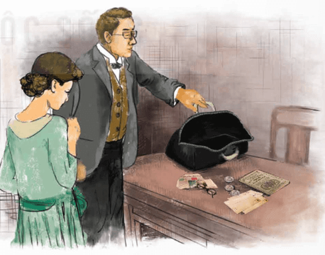 Cô đưa ông sang phòng khách đôi lớn, mở khoá một ngăn kéo và lấy ra cái túi nhung to màu đen có móc khoá bằng bạc cũ kĩ.