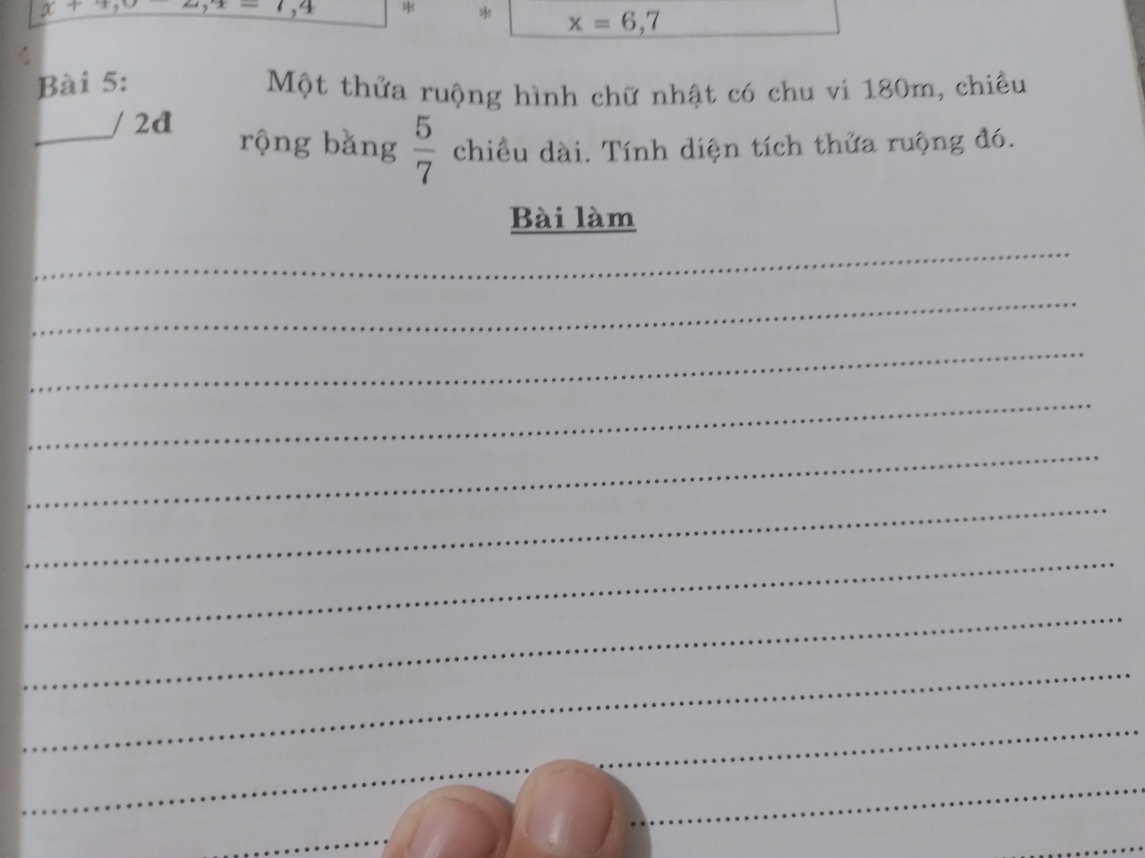 , chiều rộng bằng 5/7 chiều dài. Tính diện tích thửa ruộng đó.