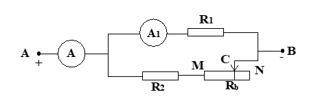 Bài tập 2. Cho mạch điện như hình vẽ. Biết UAB không đổi, R1 = 18 Ω, R2 = 12 Ω, biến trở có điện trở toàn phần là Rb = 60 Ω, điện trở của dây nối và các ampe kế không đáng kể.