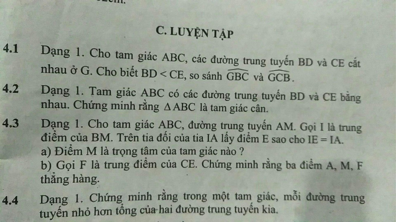 Tam giác ABC có các đường trung tuyến BD và CE bằng nhau. Chứng minh tam giác ABC cân