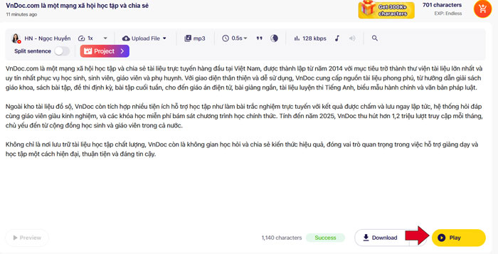 Bước 6: Sau khi quá trình chuyển đổi hoàn tất, nhấn nút Nghe audio để nghe kết quả và kiểm tra xem giọng nói có đúng như mong muốn hay không.