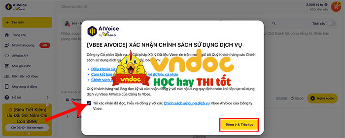 Bước 3: Chấp nhận điều kiện và điều khoản của Vbee. Sau đó nhấn vào Studio.