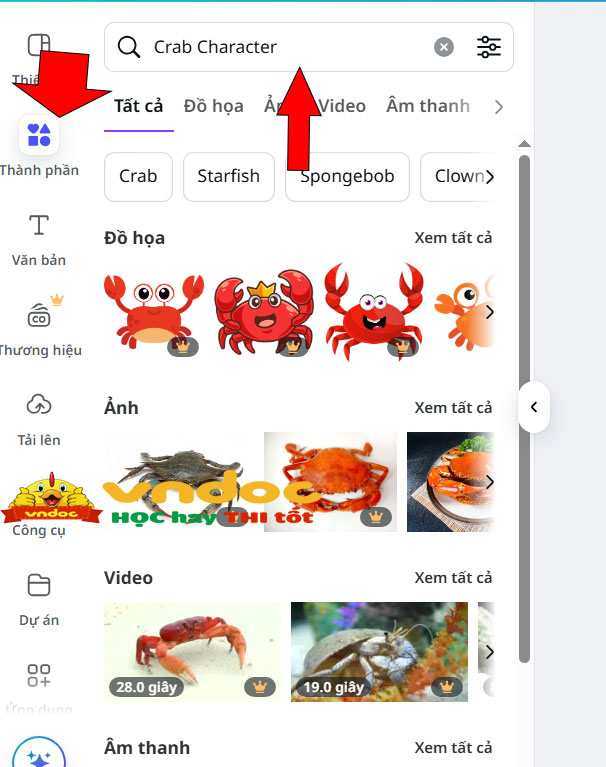 - Truy cập vào Canva -> đăng nhập-> chọn mục Thành phần -> gõ từ khóa Crab Character ở phần tìm kiếm -> Chọn nhân vật phù hợp với yêu cầu.