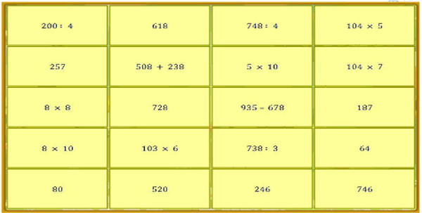 200 : 4 = .........; 8 x 8 = .........; 8 x 10 = ..........; 508 + 238 = ........; 103 x 6 = .........; 748 : 4 = .......; 935 - 678 = ............; 738 : 3 = .........; 104 x 5 = ..........; 104 x 7 = .........200 : 4 = 5 x 10; 8 x 8 = 64; 8 x 10 = 80; 508 + 238 = 746; 103 x 6 = 618; 748 : 4 = 187; 935 - 678 = 257; 738 : 3 = 246; 104 x 5 = 520; 104 x 7 = 728||5 x 10; 64; 80; 746; 618; 187; 257; 246; 520; 728