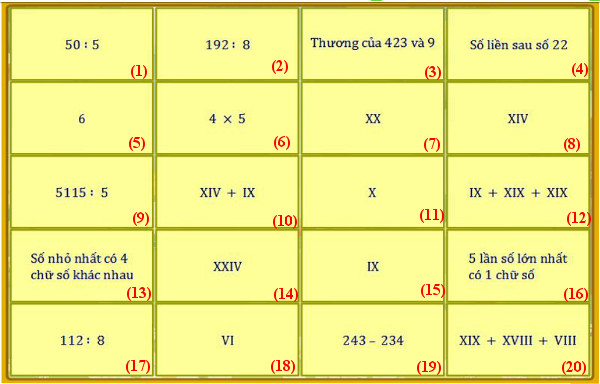 Nhập số thứ tự của các ô vào chỗ (....) cho thích hợp để được các cặp giá trị bằng nhau.