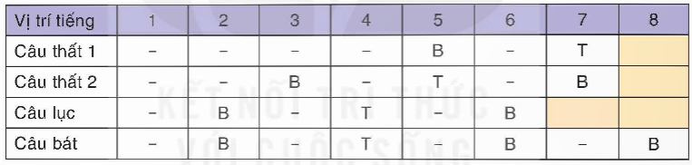 Về thanh điệu, thanh bằng (B) - trắc (T) của các tiếng ở một số vị trí trong câu thơ là cố định, cụ thể như sau: