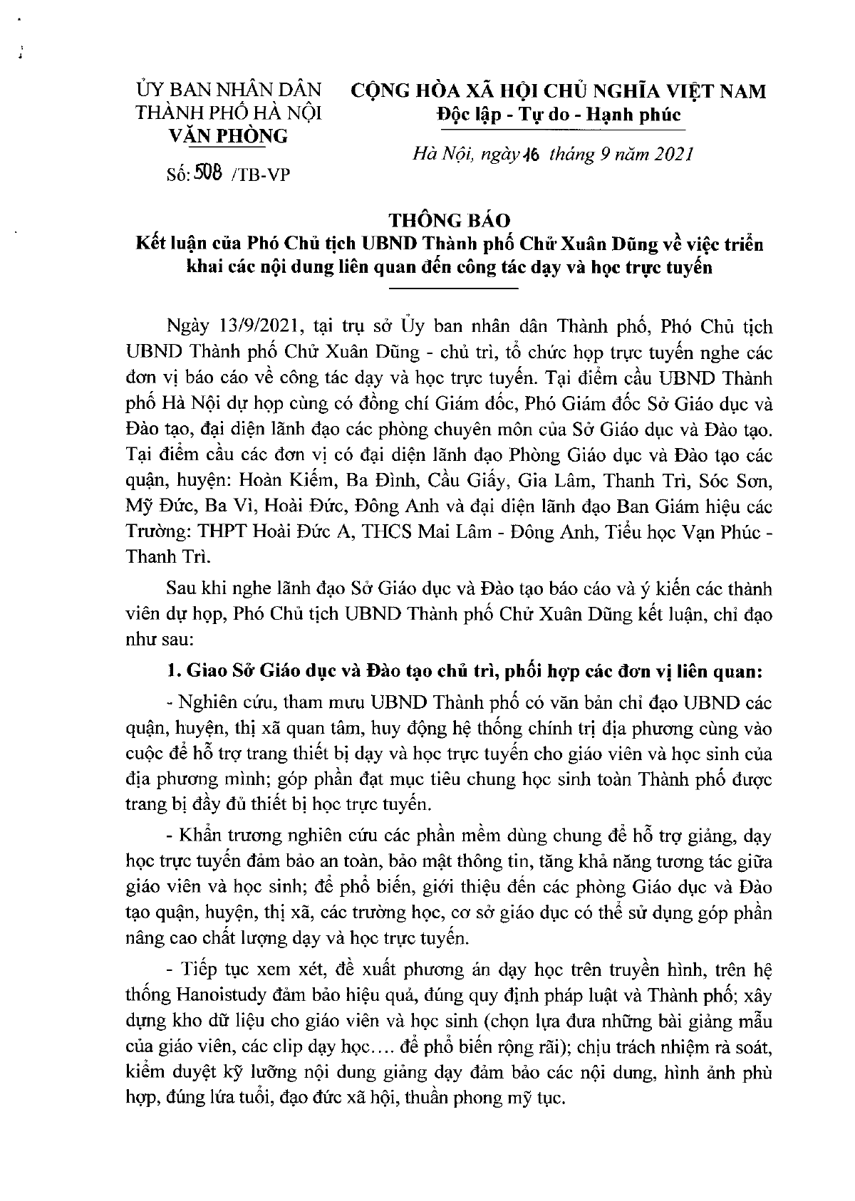 Thông báo 508/TB-VP Hà Nội 2021 triển khai các nội dung liên quan đến công tác dạy và học trực tuyến