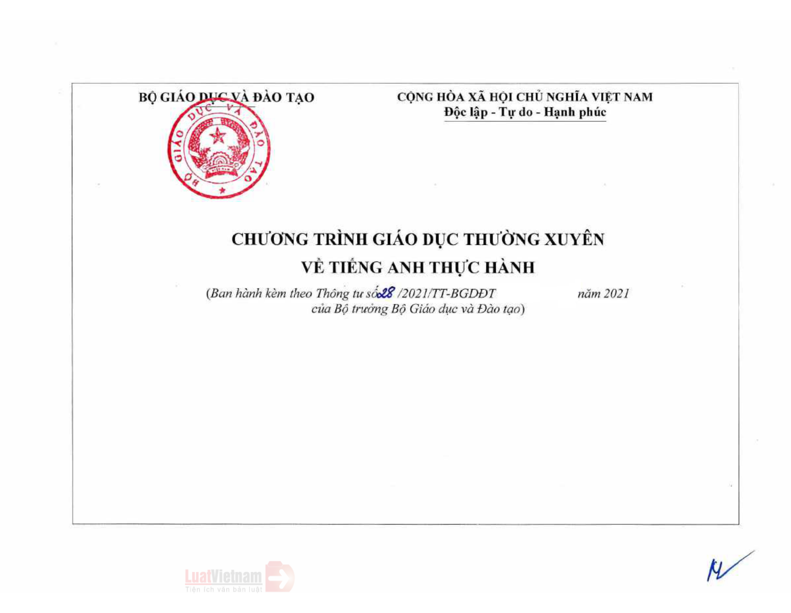 Thông tư 28/2021/TT-BGDĐT Chương trình Giáo dục thường xuyên về tiếng Anh thực hành