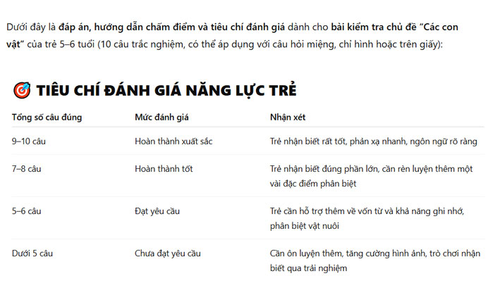 Ví dụ thực tế: Tôi là giáo viên mầm non. Hãy giúp tôi tạo bài kiểm tra đánh giá 10 câu hỏi các con vật nuôi trong gia đình trẻ 5-6 tuổi, kèm theo hình ảnh.
