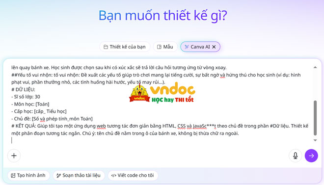 Bước 2: Copy đoạn lệnh trên dán vào ô “Mô tả ý tưởng của bạn để tôi hiện thực hóa” -> nhấn vào mũi tên -> Canva mất vài phút để tạo trò chơi theo yêu cầu của bạn.