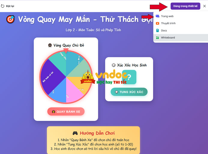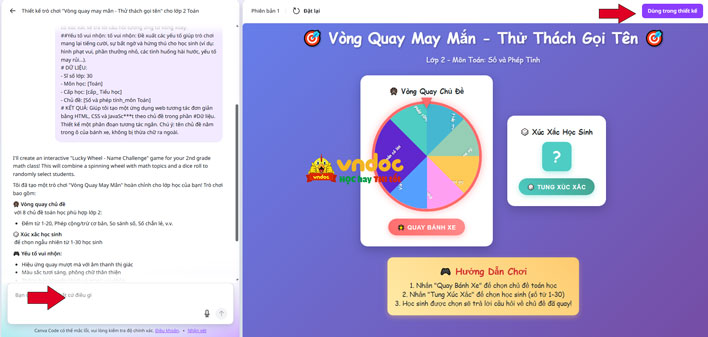 Bước 3: Canva tạo trò chơi xong, bạn xem thử nếu chưa ưng ý có thể chỉnh sửa lại câu lệnh cho phù hợp. Nếu đã ưng ý nhấn “Dùng trong thiết kế”.