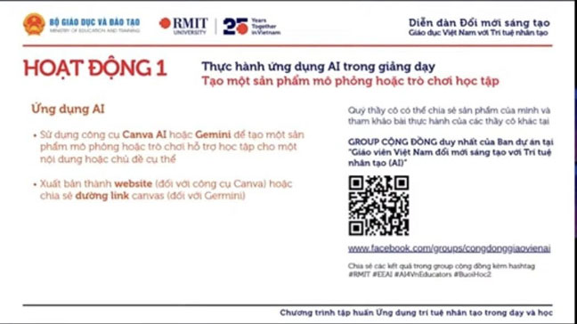 Tạo một sản phẩm mô phỏng hoặc trò chơi học tập bằng Canva hoặc Gemini là là một trong những nội dung trọng tâm thuộc Hoạt động 1 – Bài thực hành buổi 3 của chương trình tập huấn ứng dụng trí tuệ nhân tạo (AI) trong dạy và học, mà mỗi giáo viên cần thực hiện.