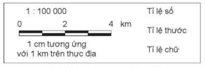 - Tỉ lệ bản đồ được biểu hiện ở ba dạng: tỉ lệ số, tỉ lệ thước, tỉ lệ chữ.