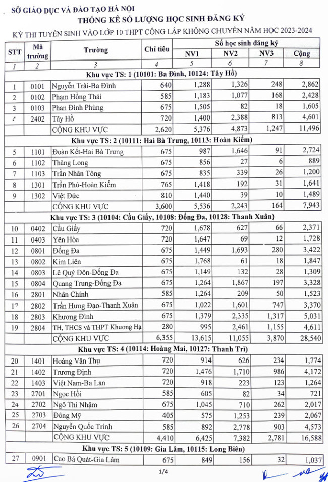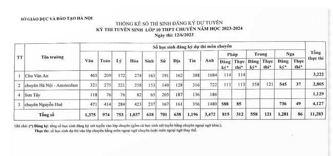 Sở Giáo dục và Đào tạo Hà Nội công bố số lượng học sinh đăng ký dự tuyển vào lớp 10 THPT của các trường trung học phổ thông công lập không chuyên và chuyên năm học 2023-2024 .