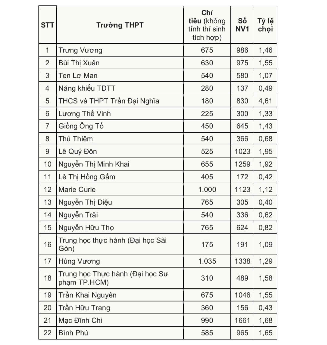 Năm nay, có 22 trường THPT có trên 1.000 nguyện vọng (NV), cao nhất là THPT Mạc Đĩnh Chi với 1.661 NV1 và thấp nhất là THPT Bình Hưng Hòa với 1.006 NV1.
