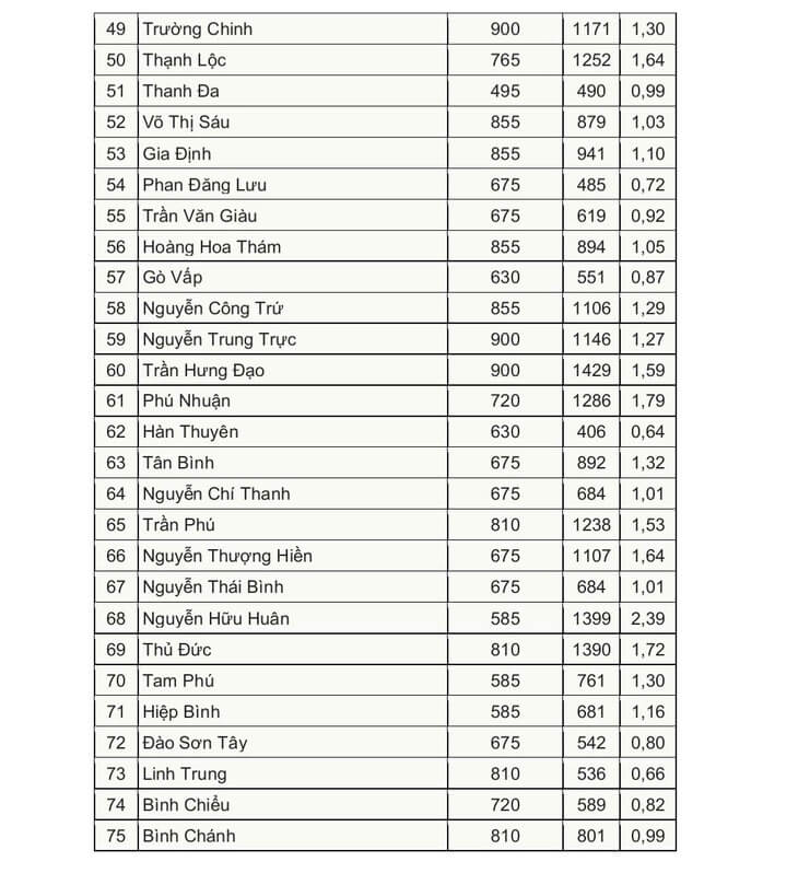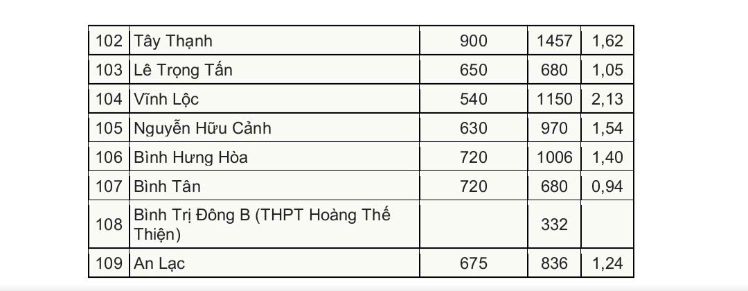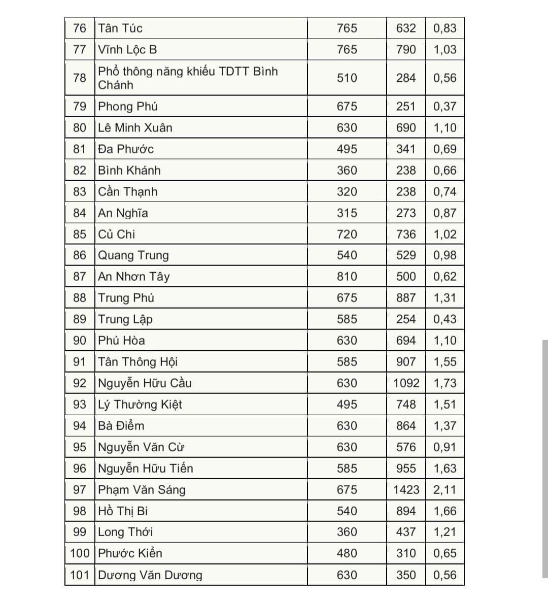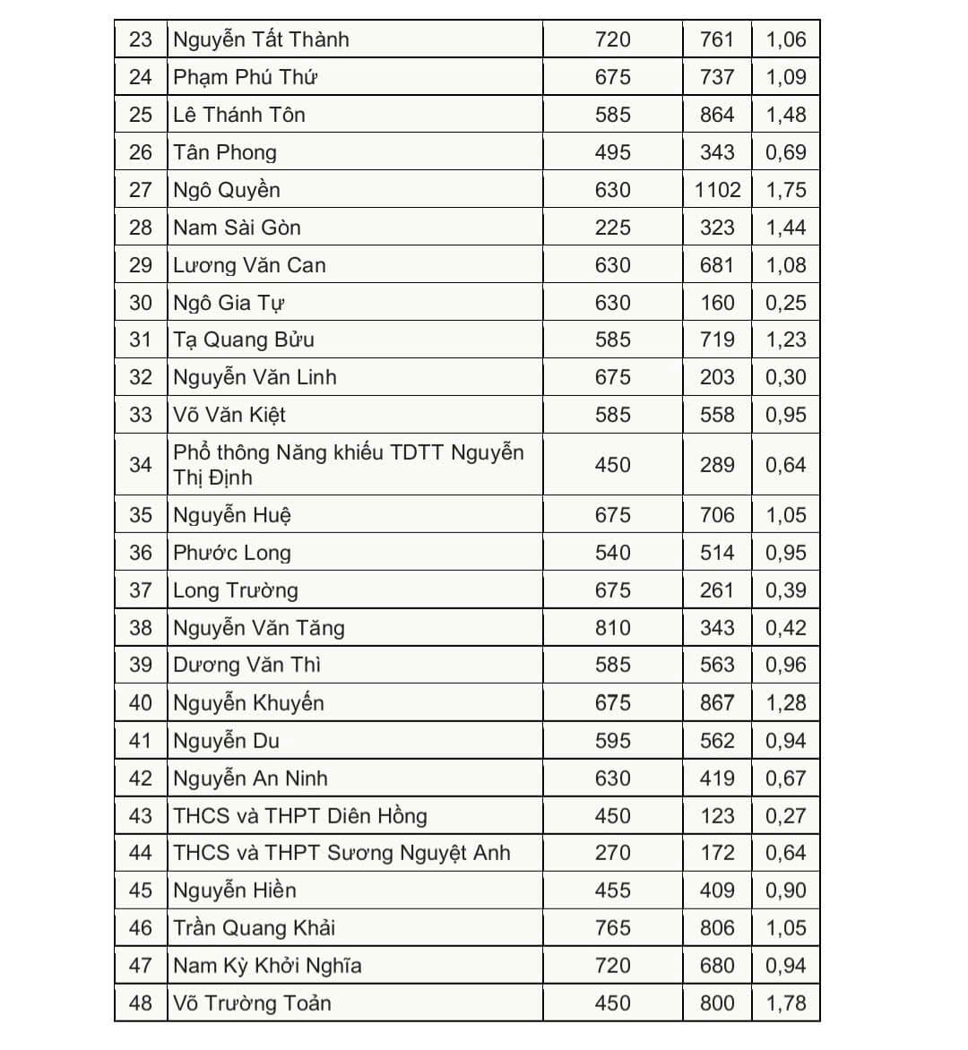 Ở chiều ngược lại, THPT Ngô Gia Tự xếp cuối bảng với tỷ lệ chọi 1/0,25. Những trường khác trong top 5 từ dưới lên là: THCS và THPT Diên Hồng, Nguyễn Văn Linh, Phong Phú, Long Trường…