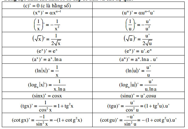 2. Bảng đạo hàm các hàm số sơ cấp cơ bản và các hệ quả