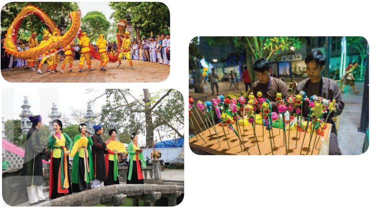 4. Work in pairs. Look at the pictures and use the cues to talk about what people in some places do to maintain their traditional lifestyle. Làm việc theo cặp. Nhìn vào các bức tranh và sử dụng các gợi ý để nói về những gì người dân ở một số nơi làm để duy trì lối sống truyền thống của họ.