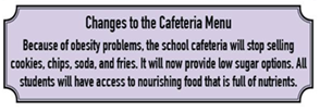 From next week, the school cafeteria will stop selling soda and junk food. Although many students like eating chips and candy at school, we are removing these foods. They are unhealthy and don’t help the students study well. Instead, we will include a variety of healthier snacks and fruit. We will also provide nourishing lunches every day for all students. We suggest noting any special diet needs on the school lunch form.