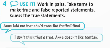 4. USE IT! Work in pairs. Take turns to make true and false reported statements. Guess the true statements.