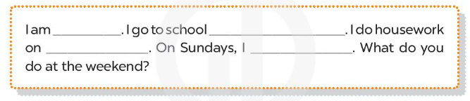 I am Nam. It is Monday today. It is a school day. I go to school on Mondays, Tuesdays, Wednesdays, Thursdays and Fridays. At the weekend, I stay at home. I do housework on Saturdays. I watch TV on Sundays. What do you do at the weekend?