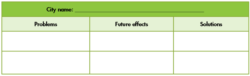 Think of a name for a city and write it in the box. Choose two problems, a future effect, and a solution for each and complete the table. (Hãy nghĩ tên của một thành phố và viết nó vào ô. Chọn hai vấn đề, hậu quả trong tương lai và giải pháp cho mỗi vấn đề và hoàn thành bảng.)