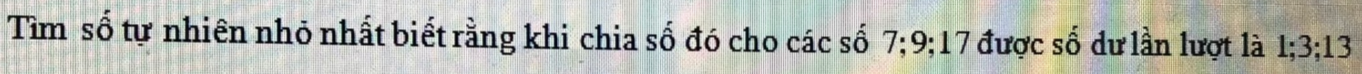 Tìm số tự nhiên nhỏ nhất biết rằng khi chia số đó cho các số 7; 9; 17 được số dư lần lượt là 1; 3; 13