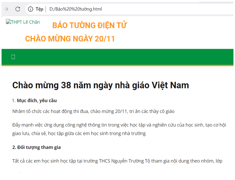 <p> Hình thức: các lớp sử dụng các thể loại thơ, nhạc, kể chuyện, tranh vẽ… (sử dụng song song kênh hình và kênh tiếng) tạo một tờ báo tường điện tử “Chào mừng ngày nhà giáo Việt Nam”. Sản phẩm phải được phổ biến trên môi trường mạng</p>