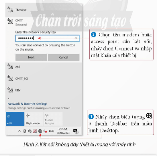 Vận dụng trang 19 Tin học 12: Kết nối không dây thiết bị mạng với máy tính. Với các thiết bị được giáo viên chuẩn bị sẵn, em thực hiện kết nối không dây với moden, access point với máy tính.